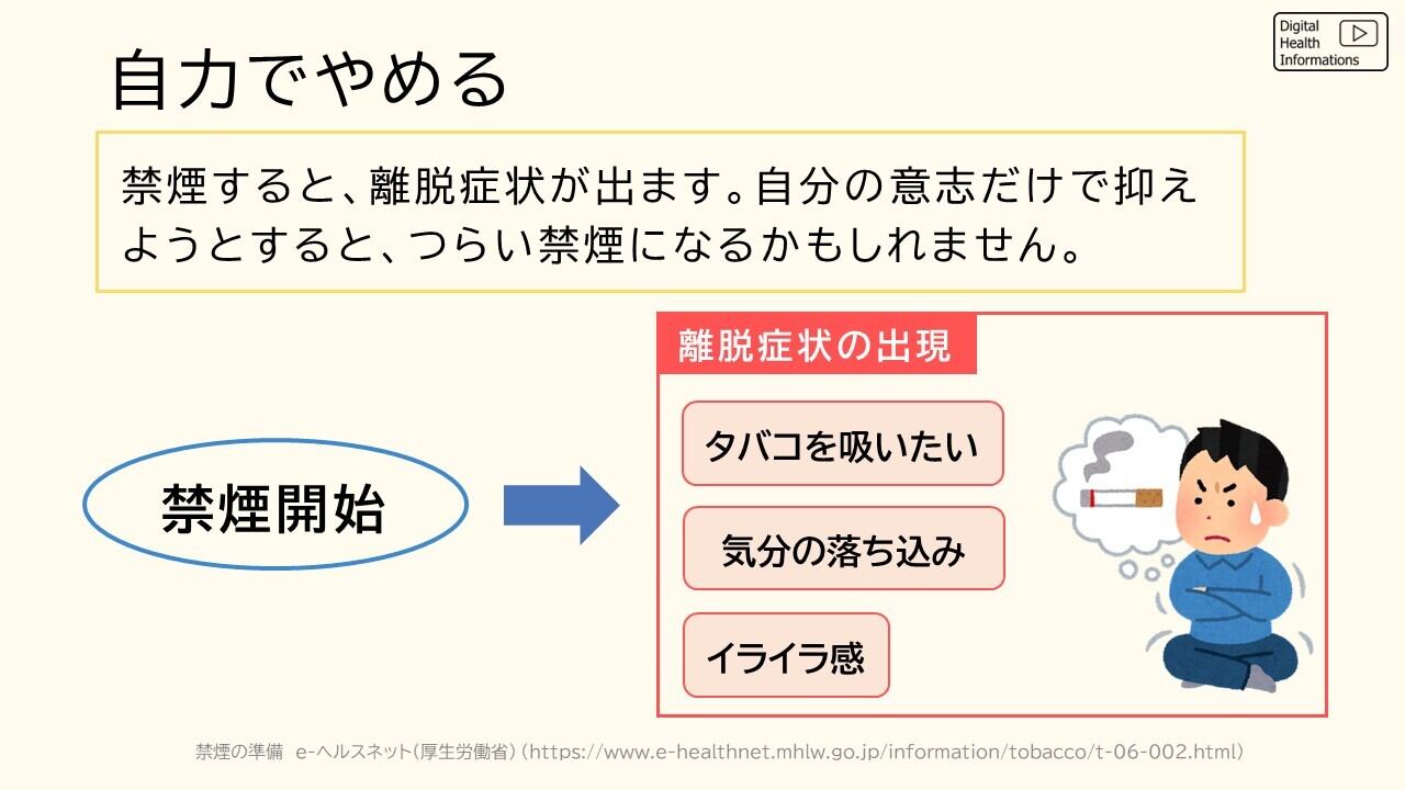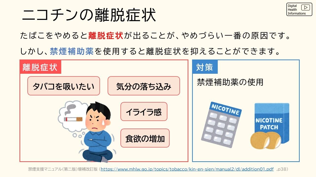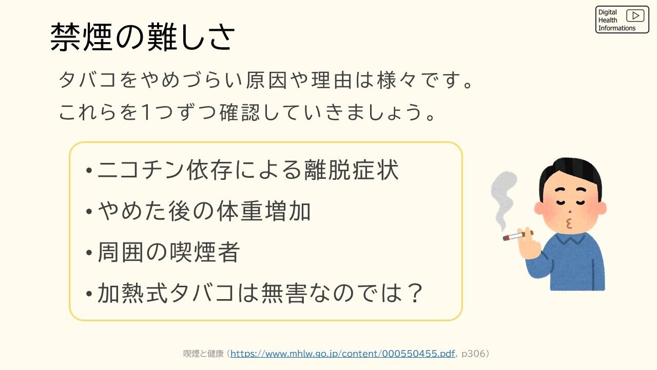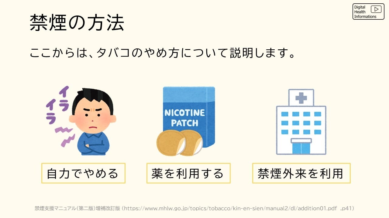 前半はタバコをやめづらい要因に対する対処法、後半はタバコのやめ方についての簡単な説明を行っています。