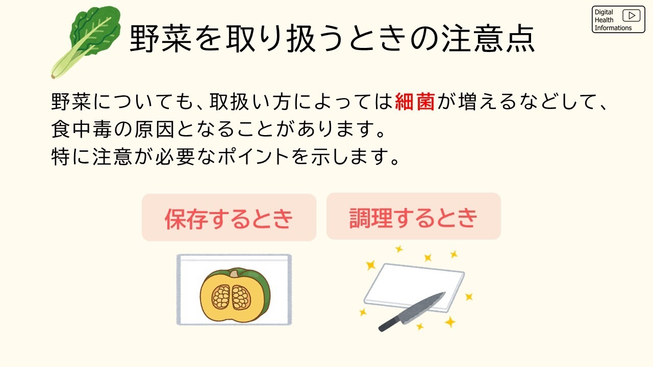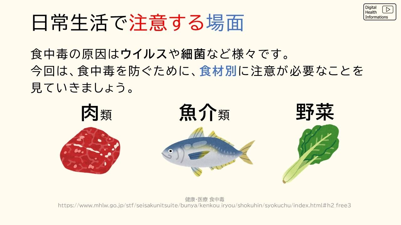 この動画は、肉・魚・野菜の3種類の食材について、取り扱いや保存方法、調理のポイントなど、基本的な予防方法を解説しています。