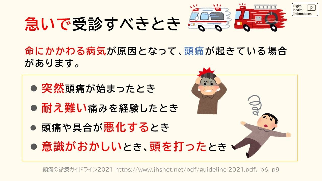 頭痛の種類、症状の特徴、急いで受診すべき頭痛の特徴などの内容で作成しています。